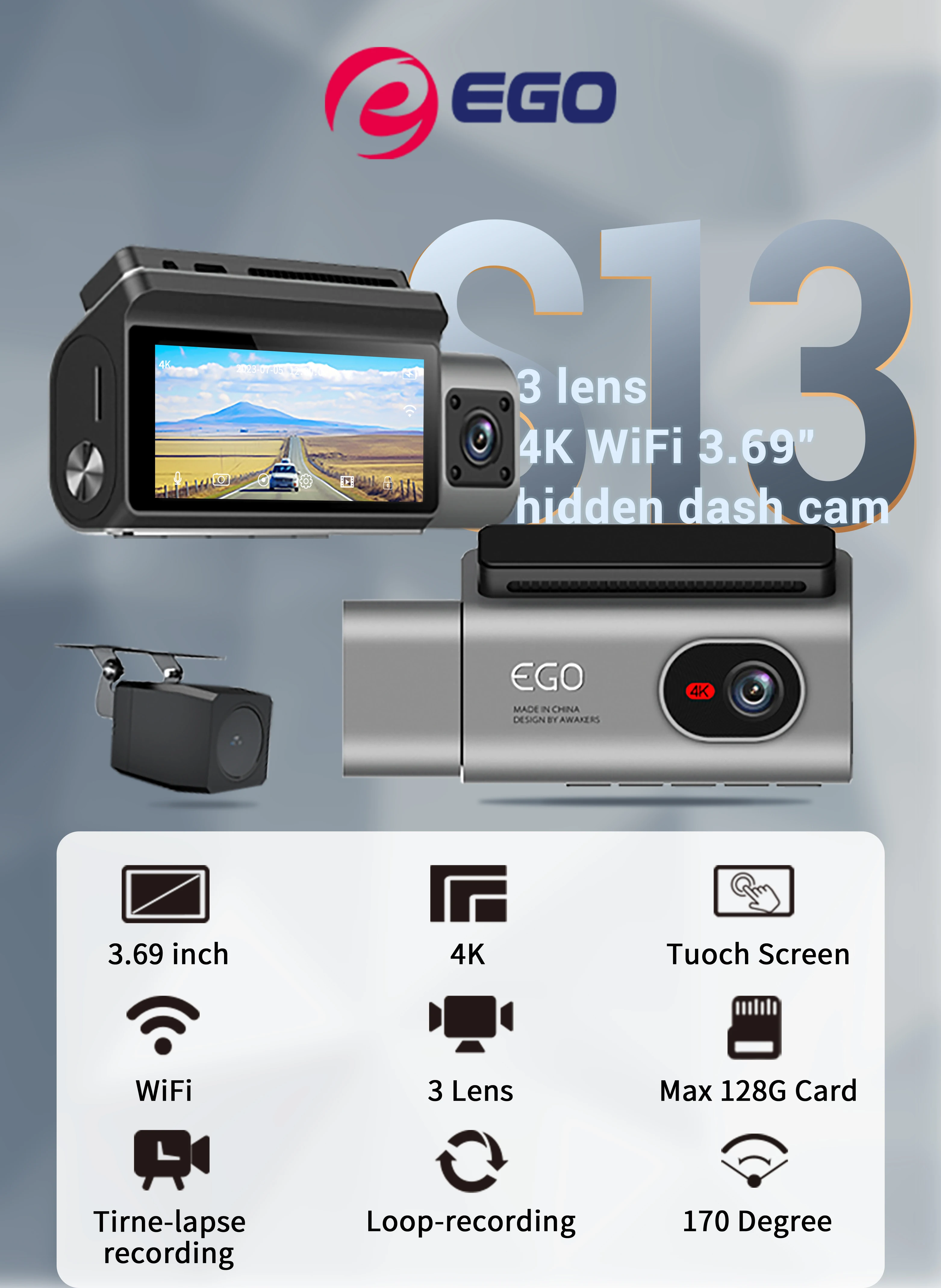 The S13 Model 3Lens Car Camera is the epitome of vehicle safety and monitoring, offering unparalleled coverage and clarity with its advanced triple-lens design. With front, rear, and interior cameras, this dashcam provides comprehensive surveillance of your vehicle’s surroundings, ensuring maximum security and peace of mind on the road.