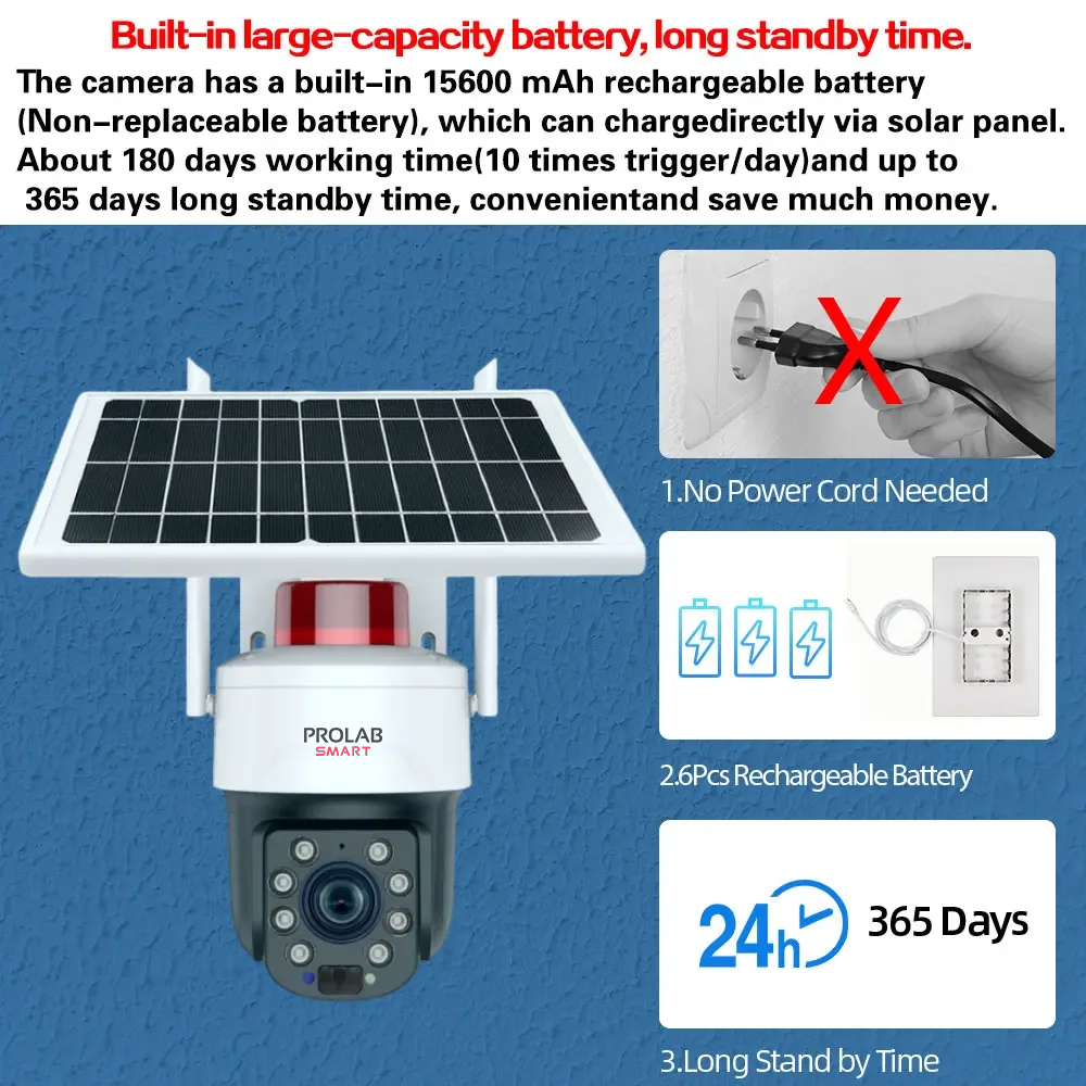 - Solar Power: Integrated solar panels harness sunlight to charge the camera’s built-in batteries, ensuring continuous operation without the need for external power sources or frequent battery replacements.