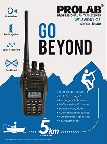 General specification Model WT-5WDB1 CE Transmitting power Frequency range 136-174MHz/400-480MHz Channel capacity 16 Channel spacing 12.5kHz Frequency stability ±1.5ppm Working temperature -20°C’ — +60°C Antenna impedance 500 Working voltage 3.7V Dimensions (L * w * h) 118x55x34mm Weight with battery) 252g Battery 2000mAh